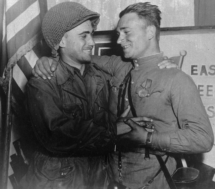 This photo, taken on April 25, 1945 near Torgau, Germany, shows 2nd Lt. William Robertson, from Los Angeles, California, and Lt. Alexander Sylvashko, of the Soviet Union, sharing a brotherly embrace.