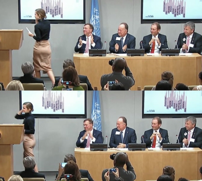 Emma Watson approaches a podium to address a United Nations panel about gender equality in September 2016
