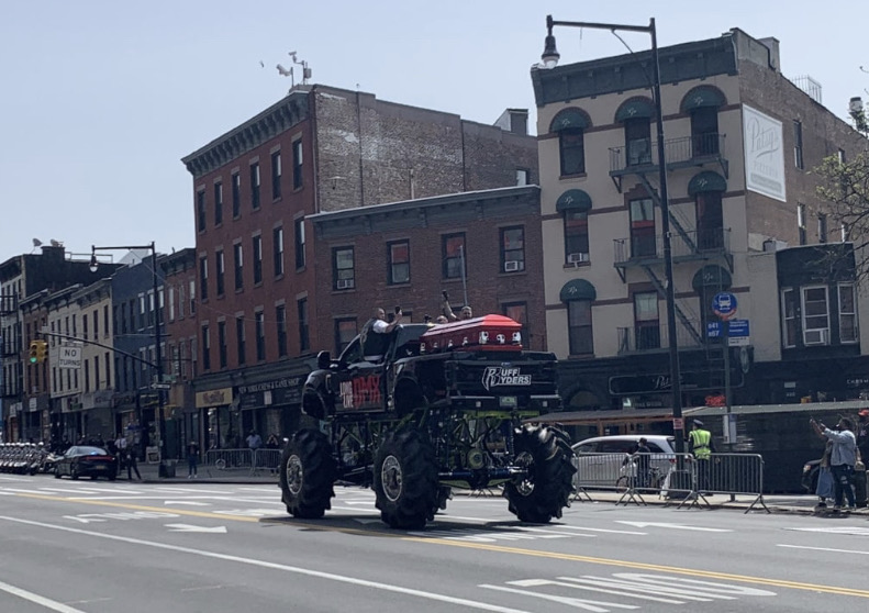 The casket (above) carrying the departed was taken to his final resting place in a barely street-legal monster truck.