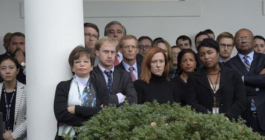 White House staff gathered in the Rose Garden to hear Obama’s remarks about Donald Trump’s victory over Hillary Clinton on November 9, 2016.