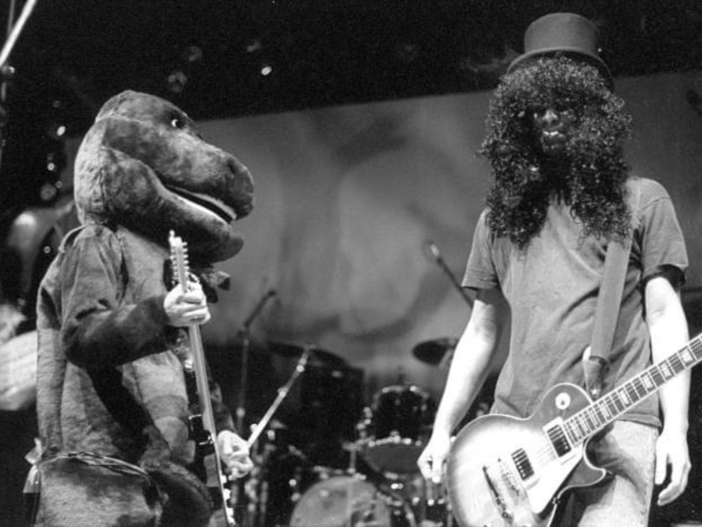 Kurt Cobain, dressed as Barney the dinosaur, and Pat Smear, as GnR lead guitarist Slash, playing at Rhodes Arena in Akron, Ohio on Halloween Night in 1993