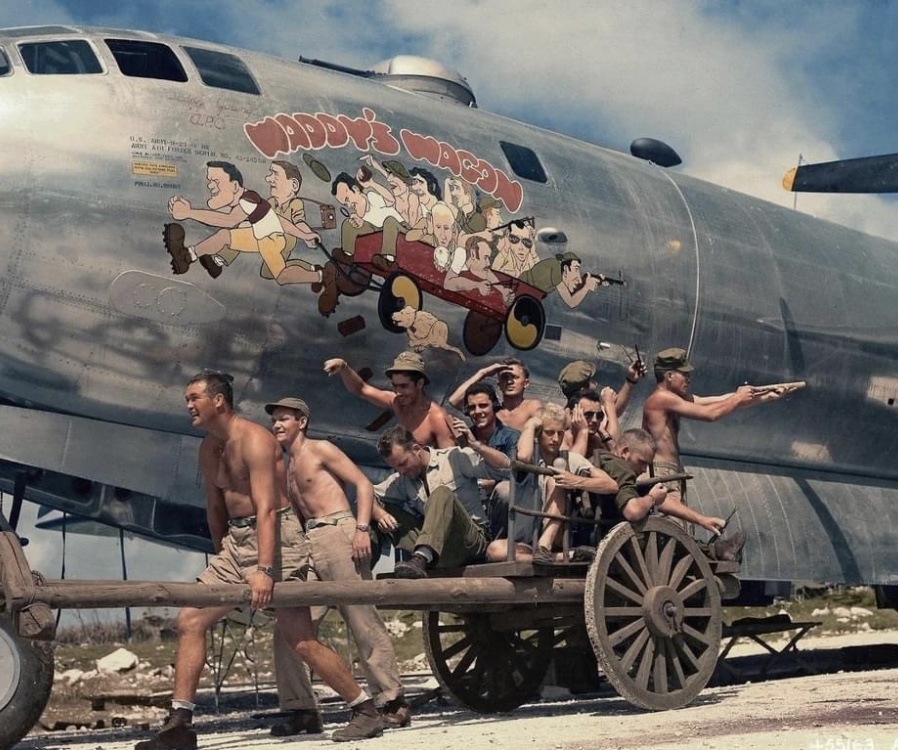 The crew of B-29 Superfortress 42-24598 “Waddy’s Wagon” posing to duplicate the nose art.