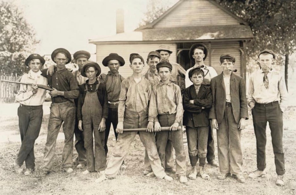 This picture of a baseball team composed of child laborers from a glassmaking factory in Indiana depicts two youngsters smoking a pipe, two others holding what is presumably their only bat, and two more guys brandishing a rifle — possibly a MacNaughton Bar-in-Wood.