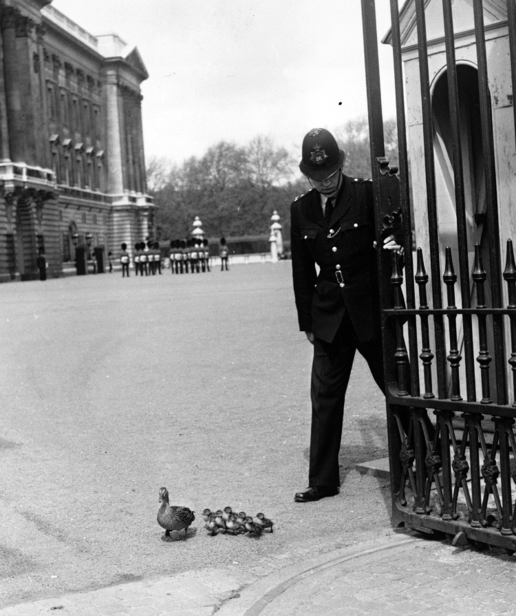 A policeman at Buckingham Palace holds the gate open for a duck and her ducklings.