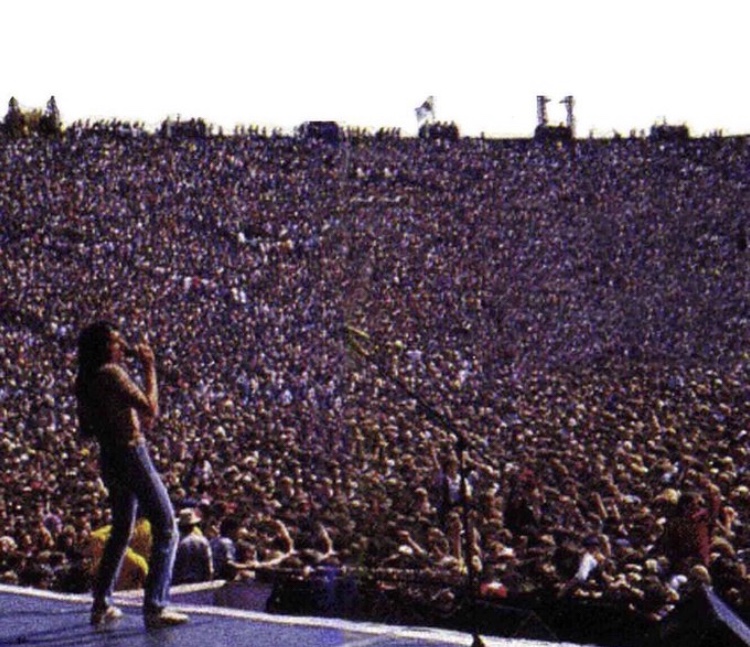 Steve Perry of Journey sings in front of more than 83,000 fans at the Rose Bowl in Pasadena, California on July 2, 1982 for the last show of their yearlong Escape Tour in support of their seventh album (stylized as E5C4P3 on the cover), which was certified Diamond by the RIAA last year with sales over 10 million.