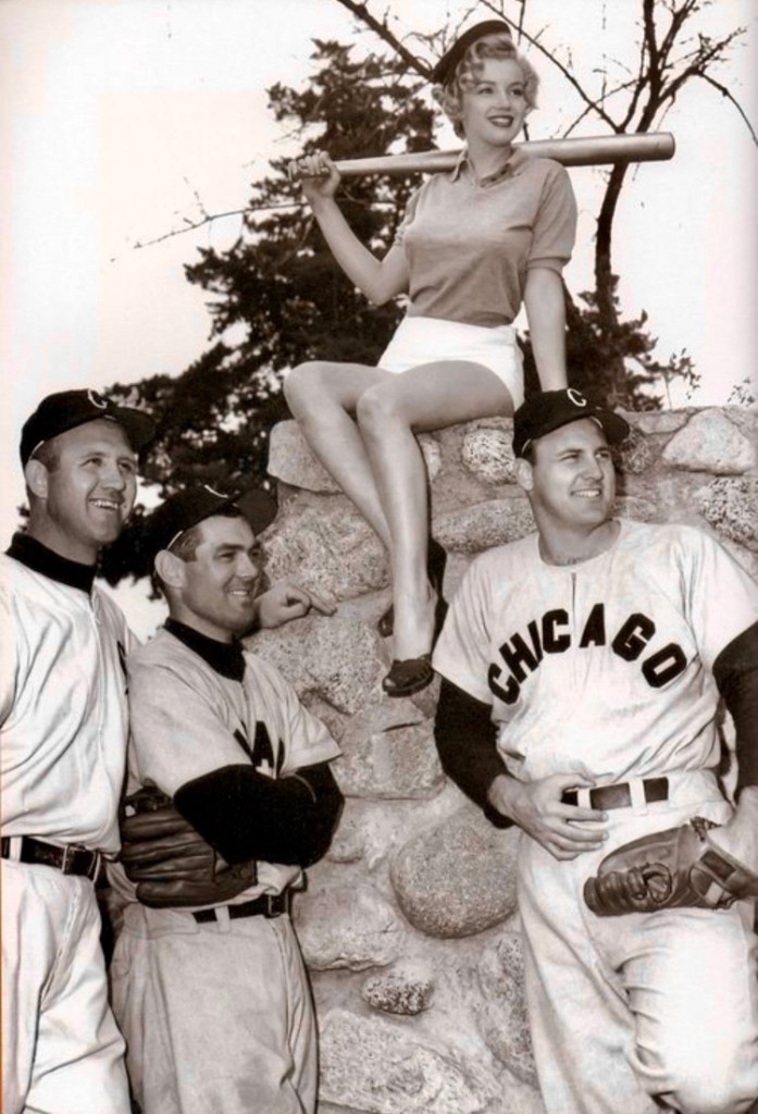Marilyn Monroe poses with unknown members of the 1951 Chicago White Sox