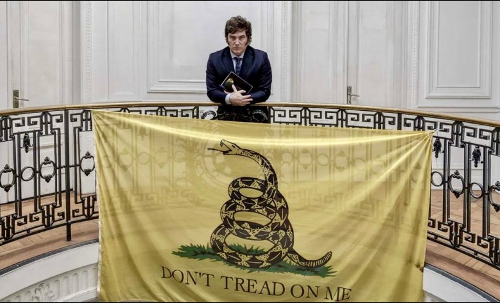 No, it’s just recently elected Argentinian 🇦🇷 president Javier “Chainsaw” Milei, who’s lived up to the hype thus far, posing with one of America’s most well-known banners that became a common sight among the La Libertad Avanza alliance during the underdog libertarian’s victory in November.